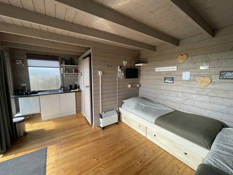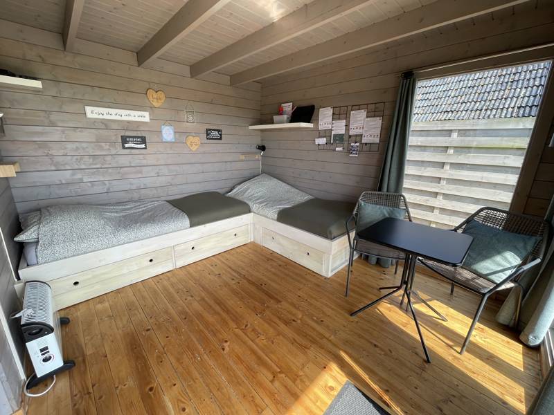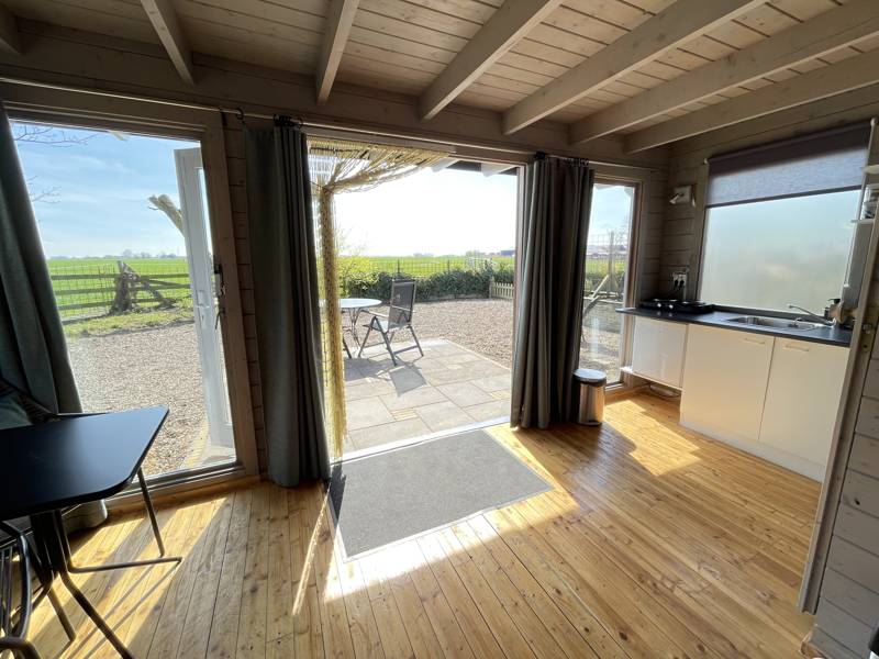 Achter de boerderij staan twee fraaie chalets met 2 losse bedden. U heeft een nette privé tuin tot u beschikking waar u kunt genieten van het mooie weidse uitzicht. Het chalet is basic, maar wel volledig ingericht.